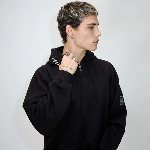 Buzo de frisa con bordado en capucha, cierre, cordon y grifa de manga lateral. Fit regular.
