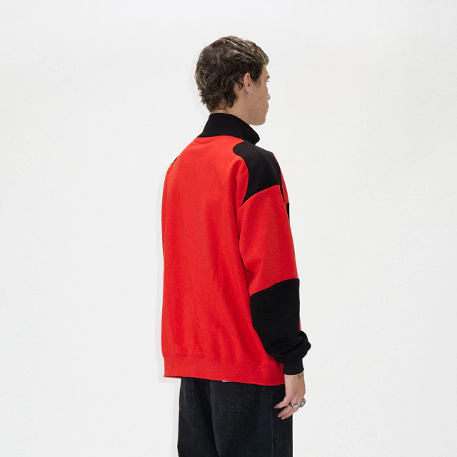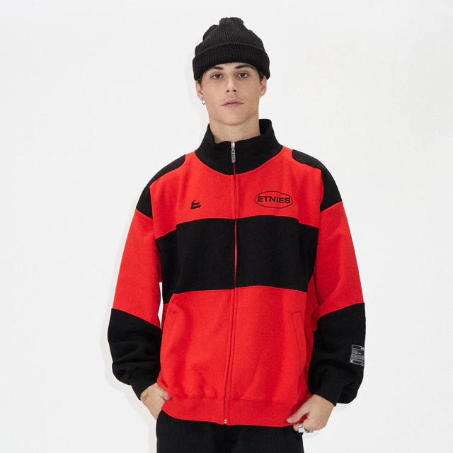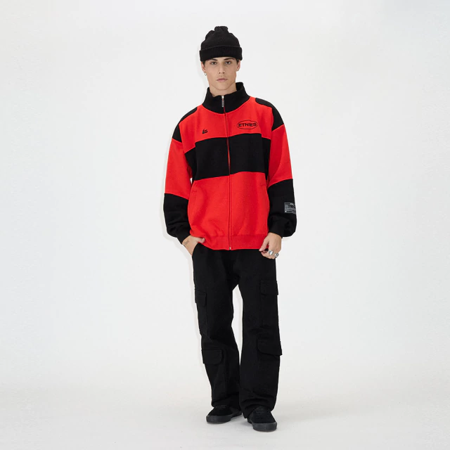 Buzo campera con cierre de friza, recortes en cuerpo y mangas a contratono, cuello alto, estampas en delantero. Fit Oversize