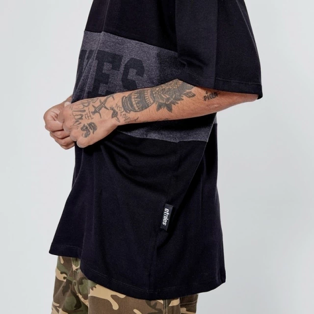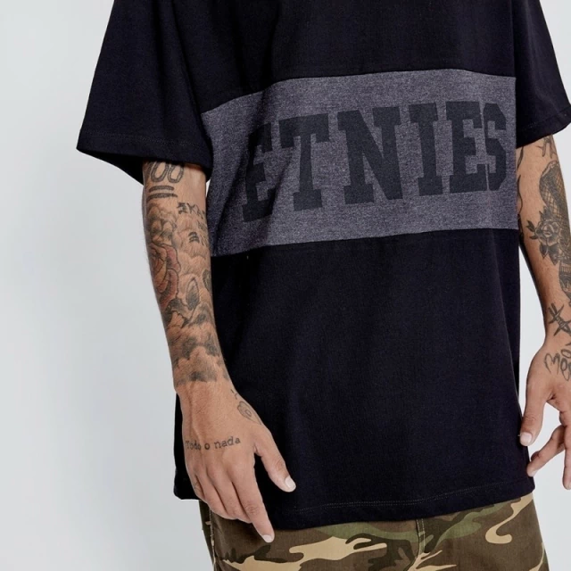 Remera de jersey, con cuello polera en rib, con recorte en delantero a contra tono y estampa en recorte, grifa lateral. fit oversize